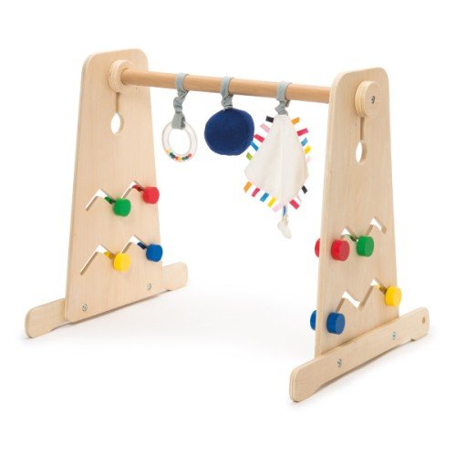 Très bonne arche, la barre peut se placer sur 2 positions. La position du haut, me permet de suspendre mes mobiles Montessori (en raccourcissant un peu mon mobile, je l’avoue). P’tit loup « joue » depuis ses 1 mois avec les boutons bleu et jaune du bas. Il a compris qu’en bougeant ses mains, cela faisait bouger les boutons et il le fait à répétition. Le seul bémol de ce portique est qu’il se desserre rapidement, mais rien d’inquiétant non plus.