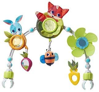 Ce jeu s’accroche très facilement partout, sur le transat, le lit parapluie, la poussette grâce à son système ingénieux d’accroche. Il est également modulable avec ses nombreuses articulations. (Les points bleus sur la photo). Il existe en plusieurs modèles.